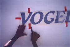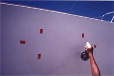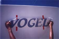 Aplique o adesivo com a máscara de transferência na superfície molhada, coincidindo os registros feitos com fita crepe na superfície com os na máscara de transferência. |